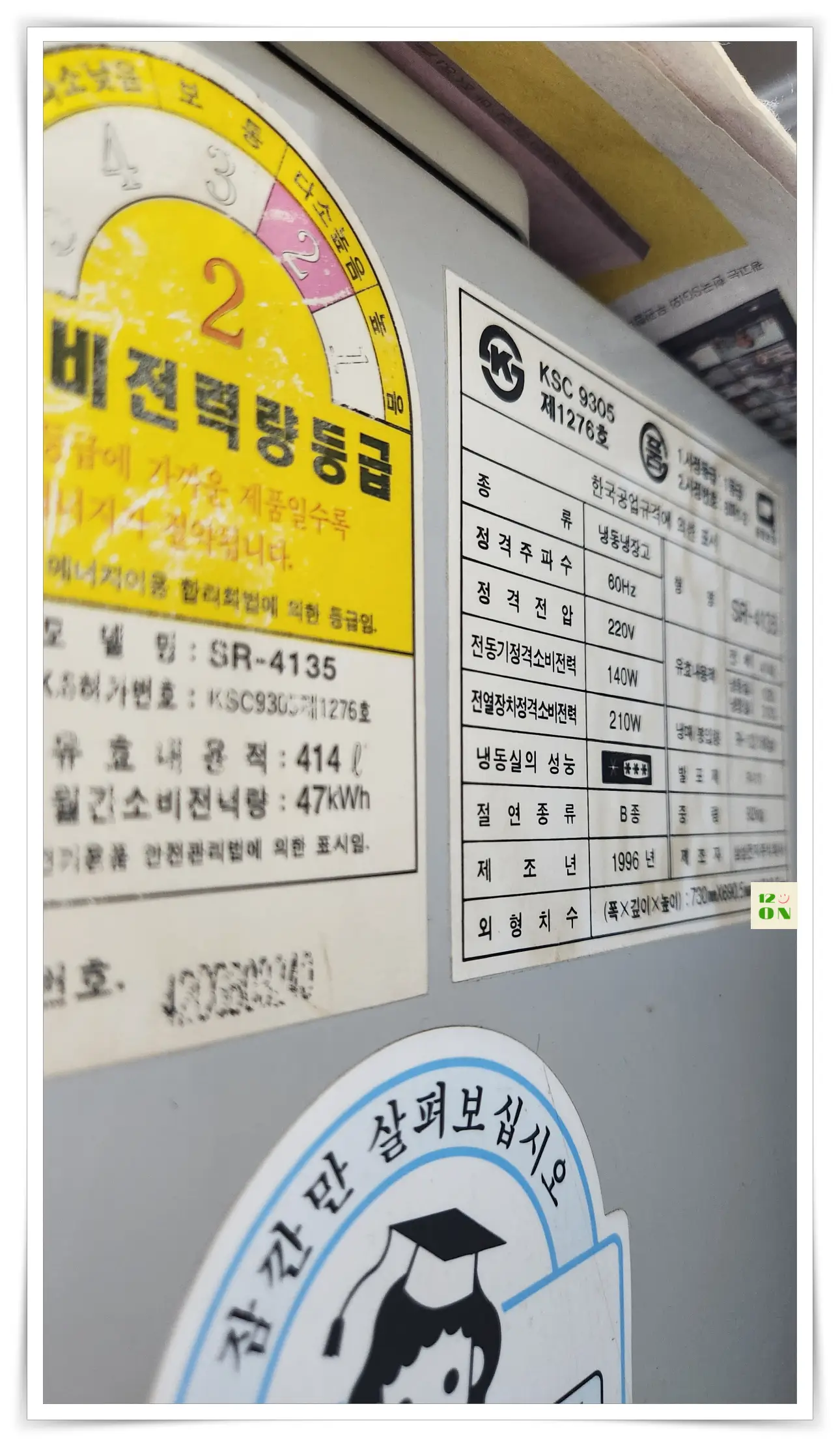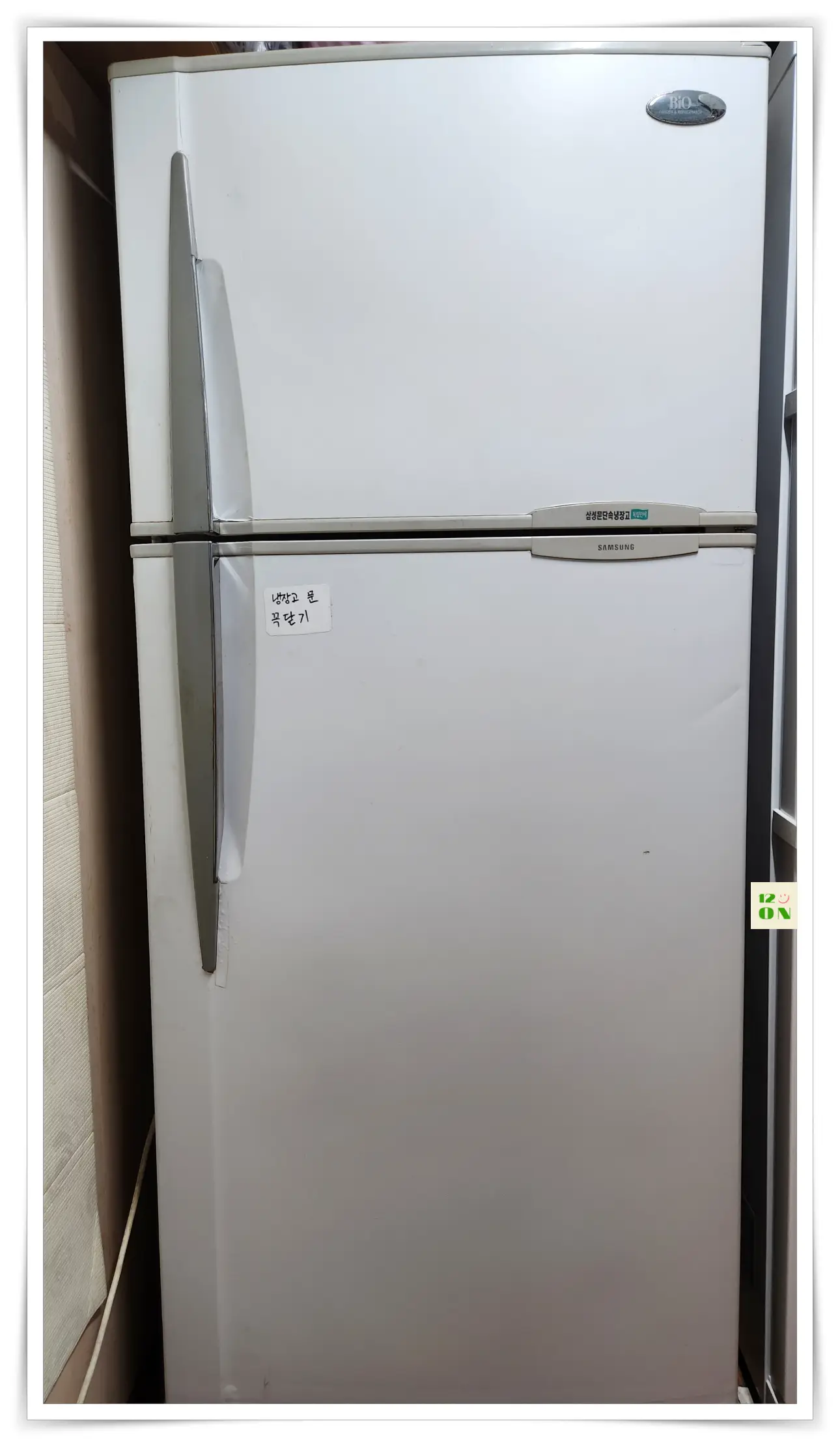 27년 된 이 냉장고는 신혼 때 산 양문형 냉장고가 8년 만에 수명이 다 되어서 고쳐보려고 했지만 수리비가 많이 들어 새 냉장고를 사야 하는 상황이었습니다. 하지만 김치냉장고도 필요했기에 김치냉장고를 선택하고 시누이 남편이 본청으로 발령이 나서 근무하는 홍천에서 사용하던 냉장고를 가져와서 사용하게 되었다. 1996년 식이라는 게 믿어지지 않을 정도로 깨끗하고 냉장고 상태도 너무 좋았습니다. 외부만 잔흠집이 있어서 흰색시트지로 붙여주었습니다. 지금까지 10년 넘게 한 번도 고장 없이 잘 사용하고 있습니다.