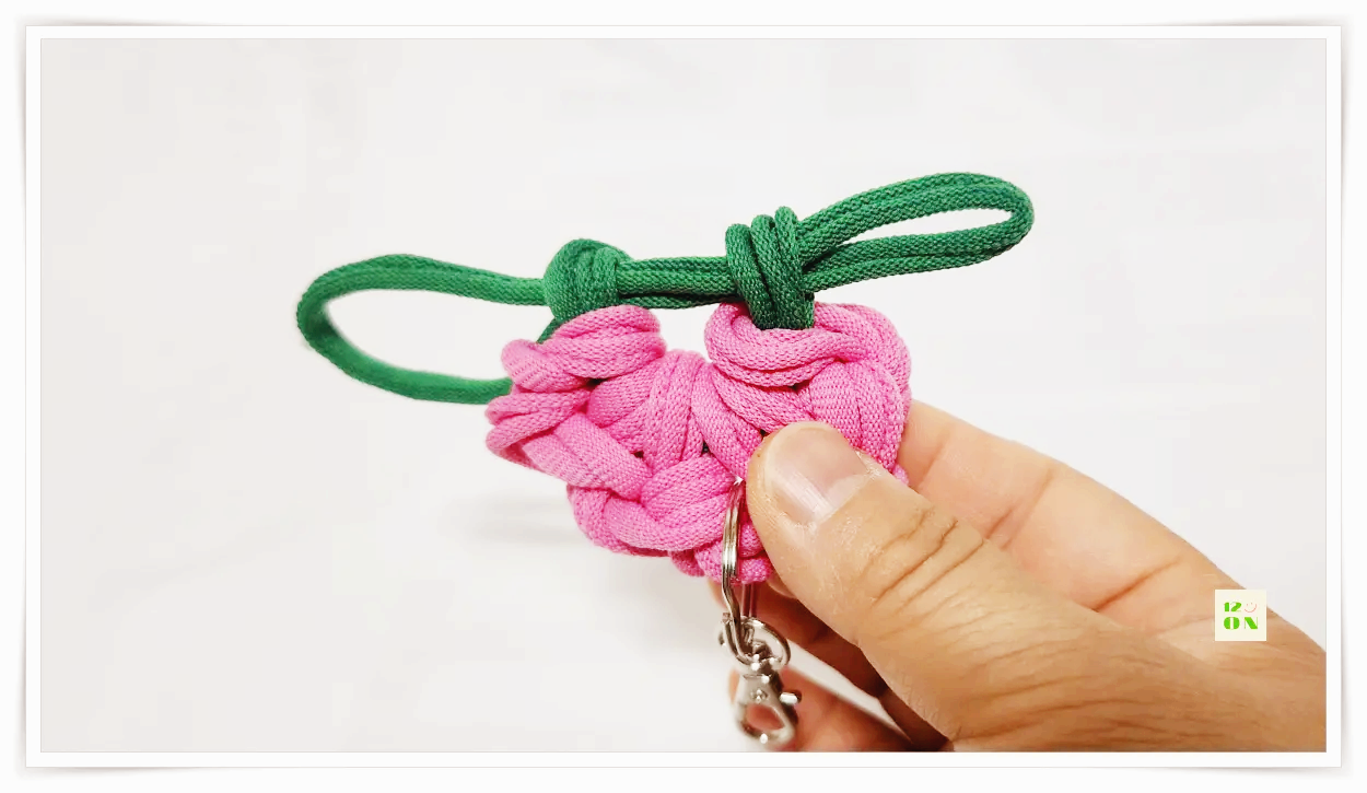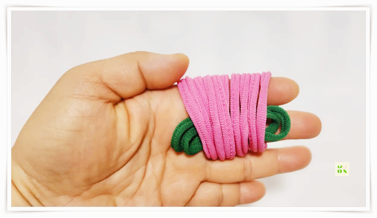 마지막 고리를 한 번 꼰 뒤 초록색 양말목을 풀고, 분홍색 양말목의 고리를 초록 양말목에 끼워줍니다.