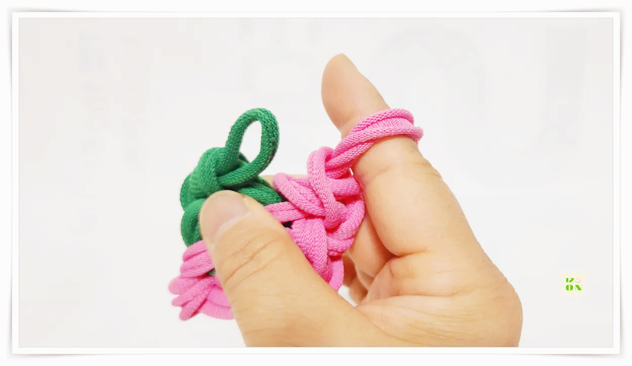 마지막 고리를 한 번 꼰 뒤 초록색 양말목을 풀고, 분홍색 양말목의 고리를 초록 양말목에 끼워줍니다.