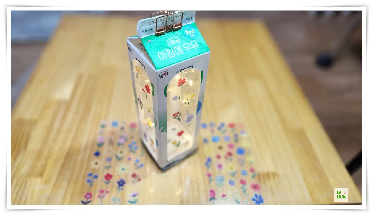 우유팩-플라스틱통-칼-가위-양면테이프-꽃스티커-LED조명
